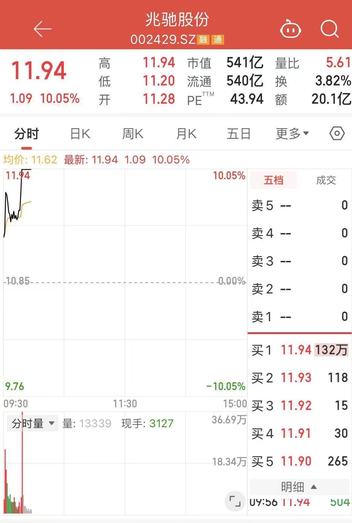 3月13日,兆驰股份(002429.SZ)股价开盘后快速拉升至涨停,截至9时56分,报11.94元/股,涨幅达10.05%。